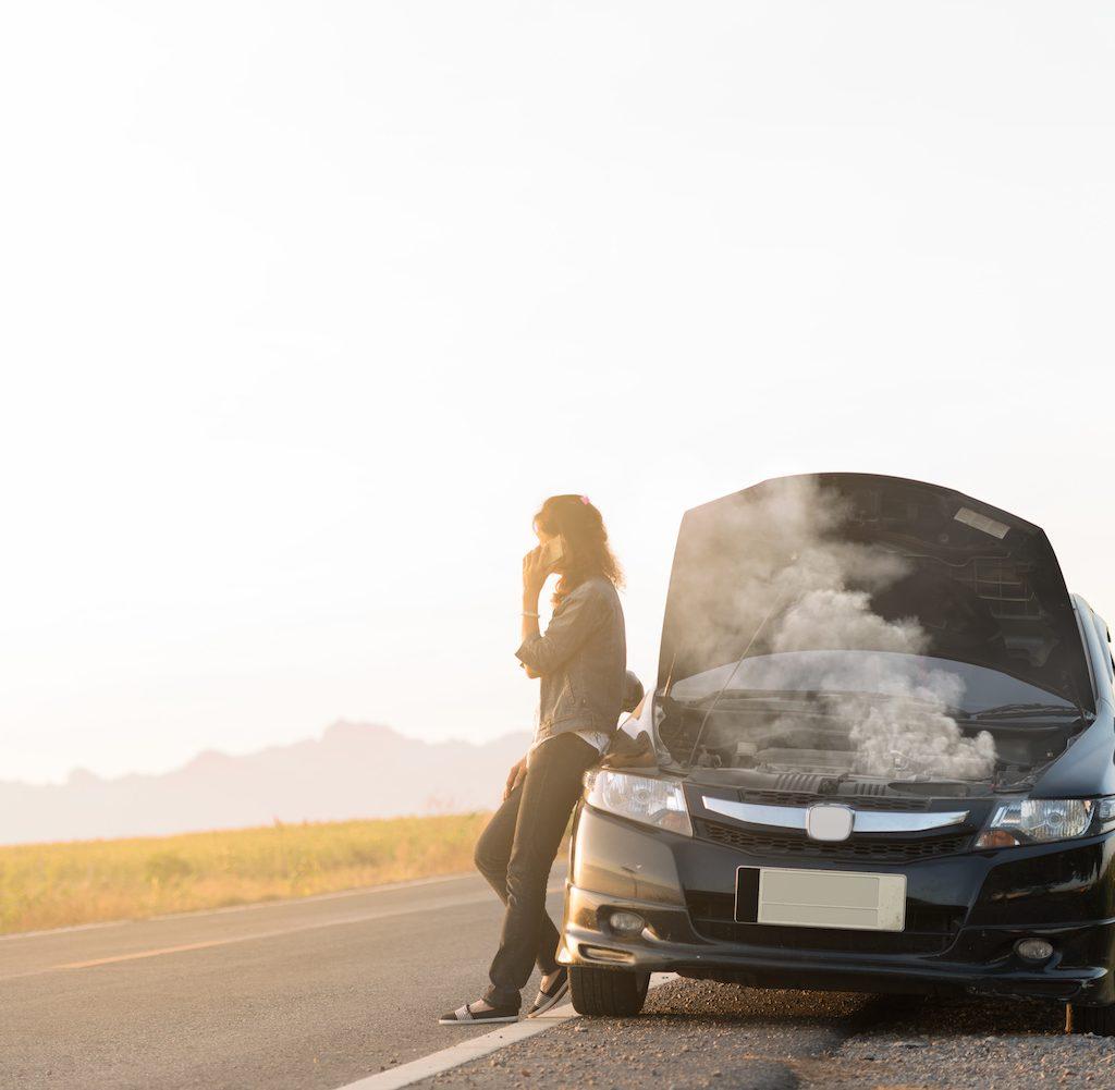 Broken car. Lady standing on the road